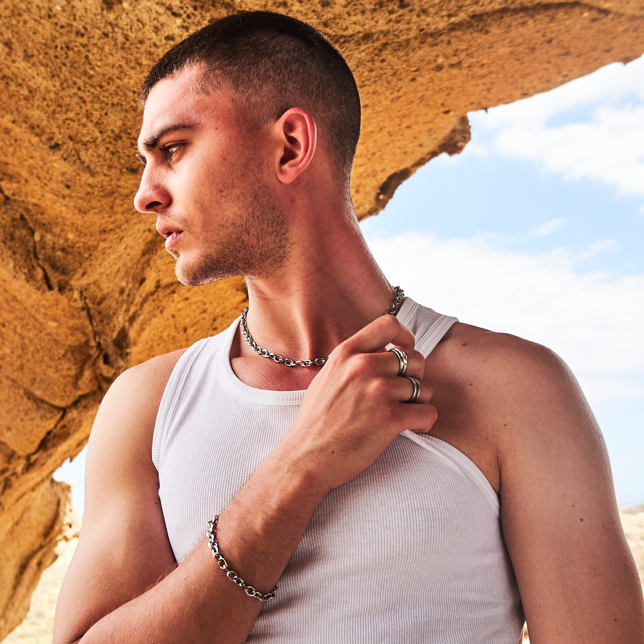 Aurora bracelet made of surgical steel, 20 cm long, each of them ends with a plaque engraved with the name YUMREY, which can be adjusted by 1 cm. The bracelet is made of a weave made of circles, whose design matches summer styling.