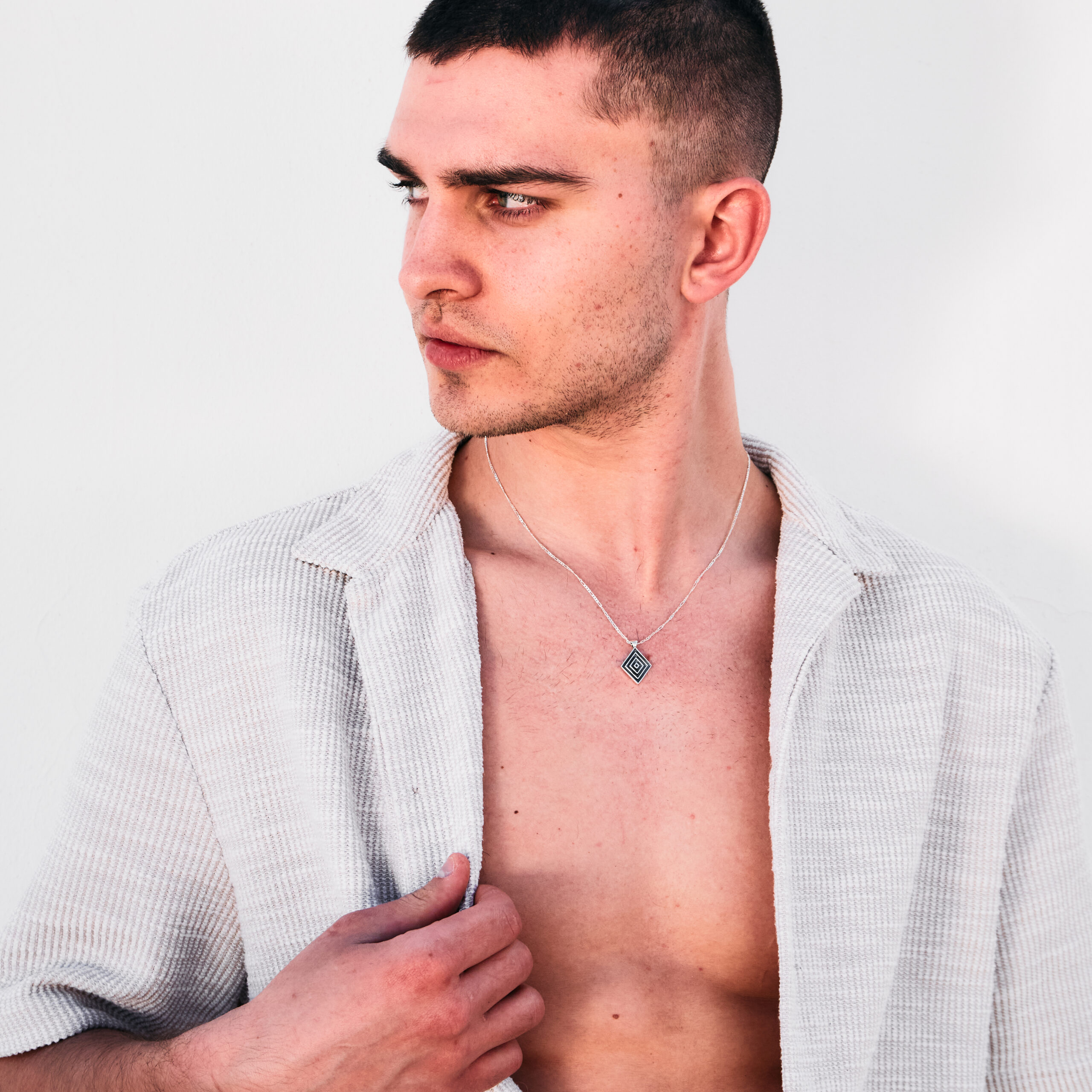 Harmony necklace made of 925 silver, 51 cm long, each chain has an extension that allows you to extend the necklace by up to 5 cm. The chain ends with an approximately 1-centimeter plaque engraved with the YUMREY brand name. The necklace is the perfect element of any summer styling. The pendant in the Harmony necklace is in the shape of a rhombus, which has three smaller rhombuses inside, and the inscription YUMREY is engraved on the back.