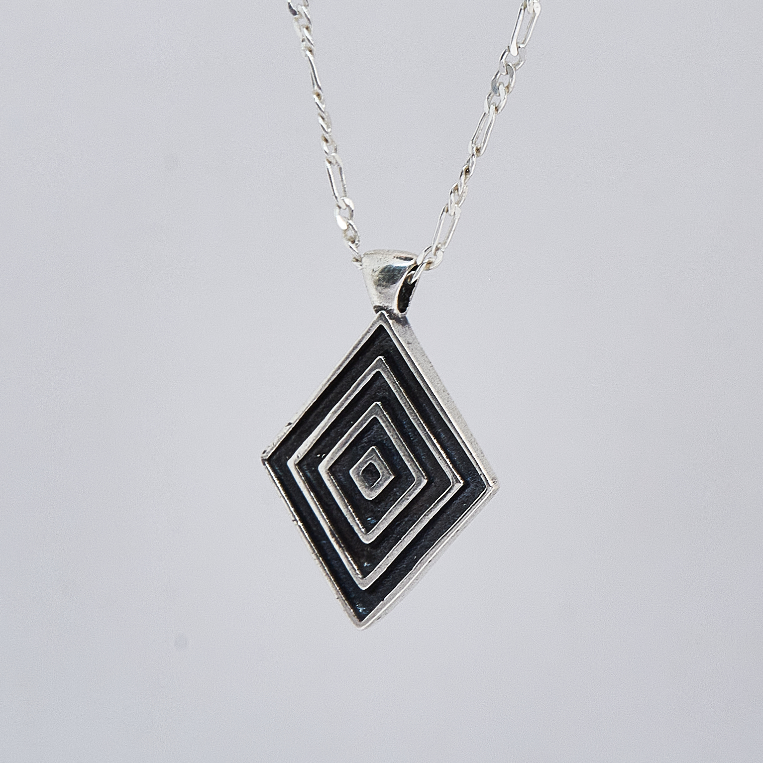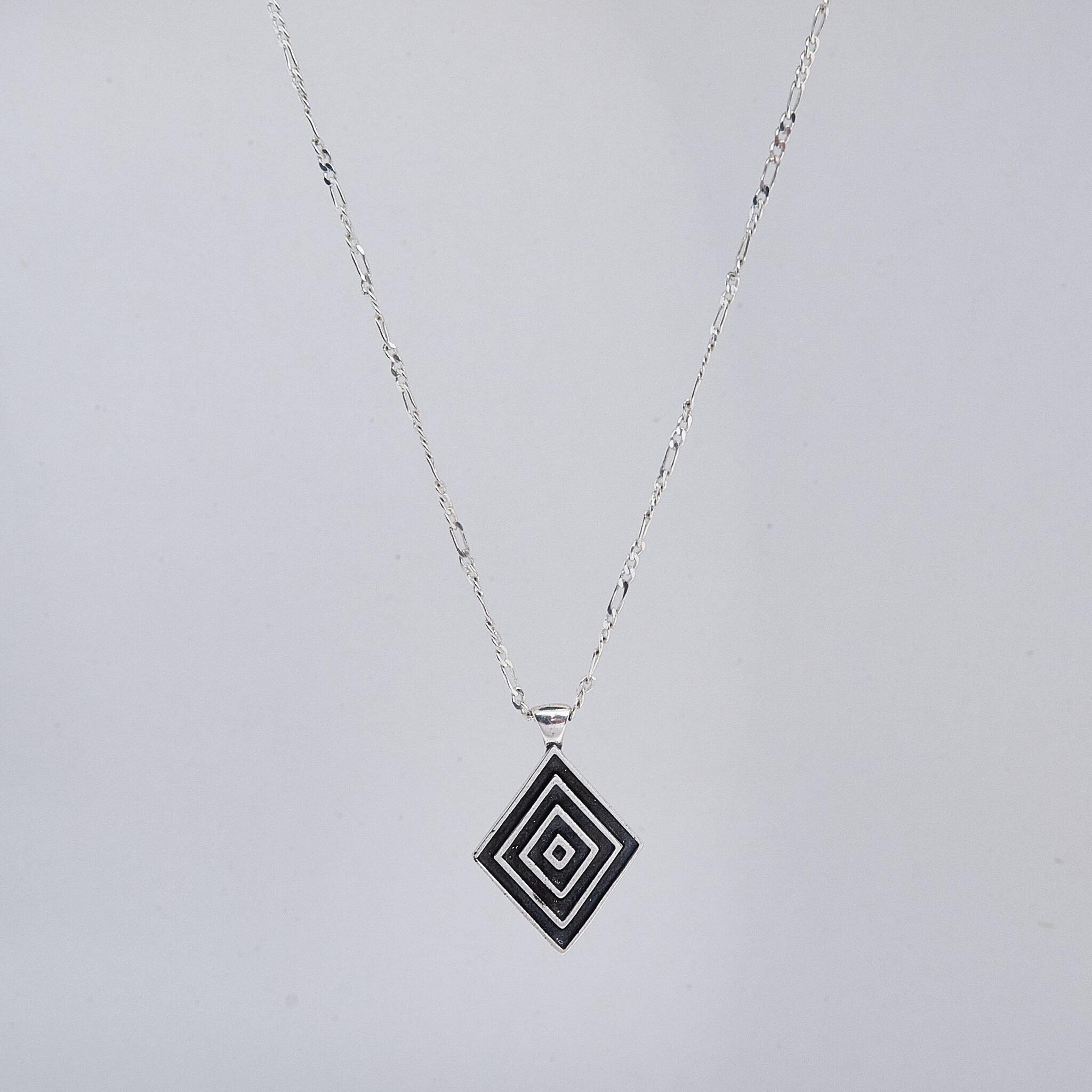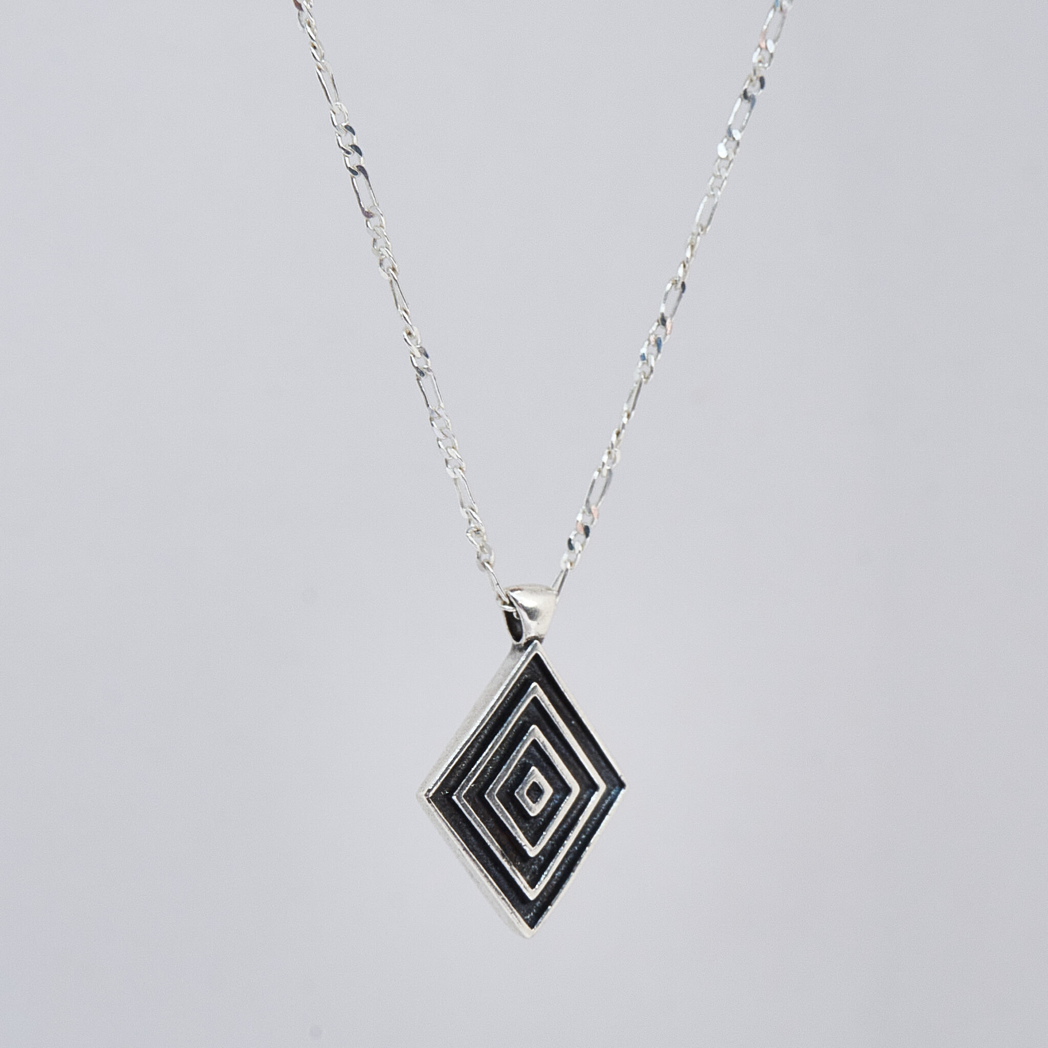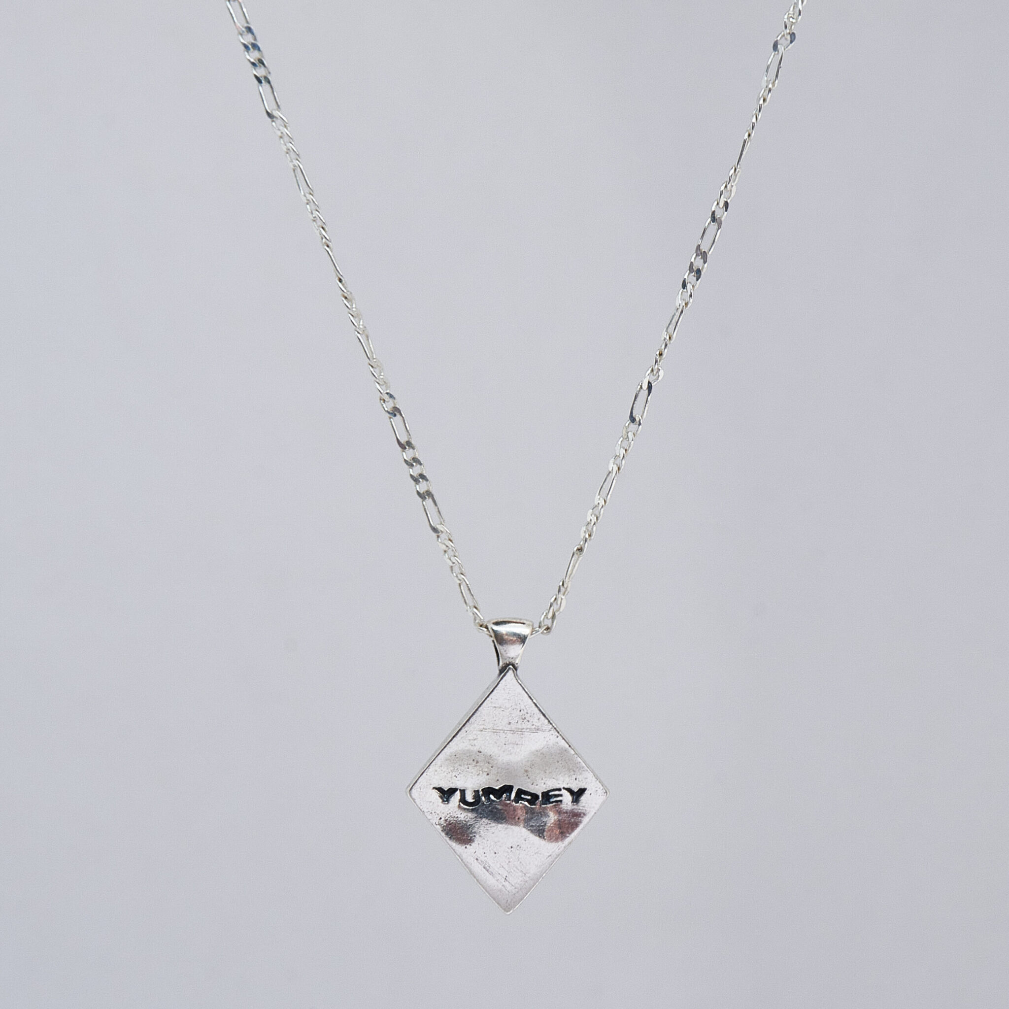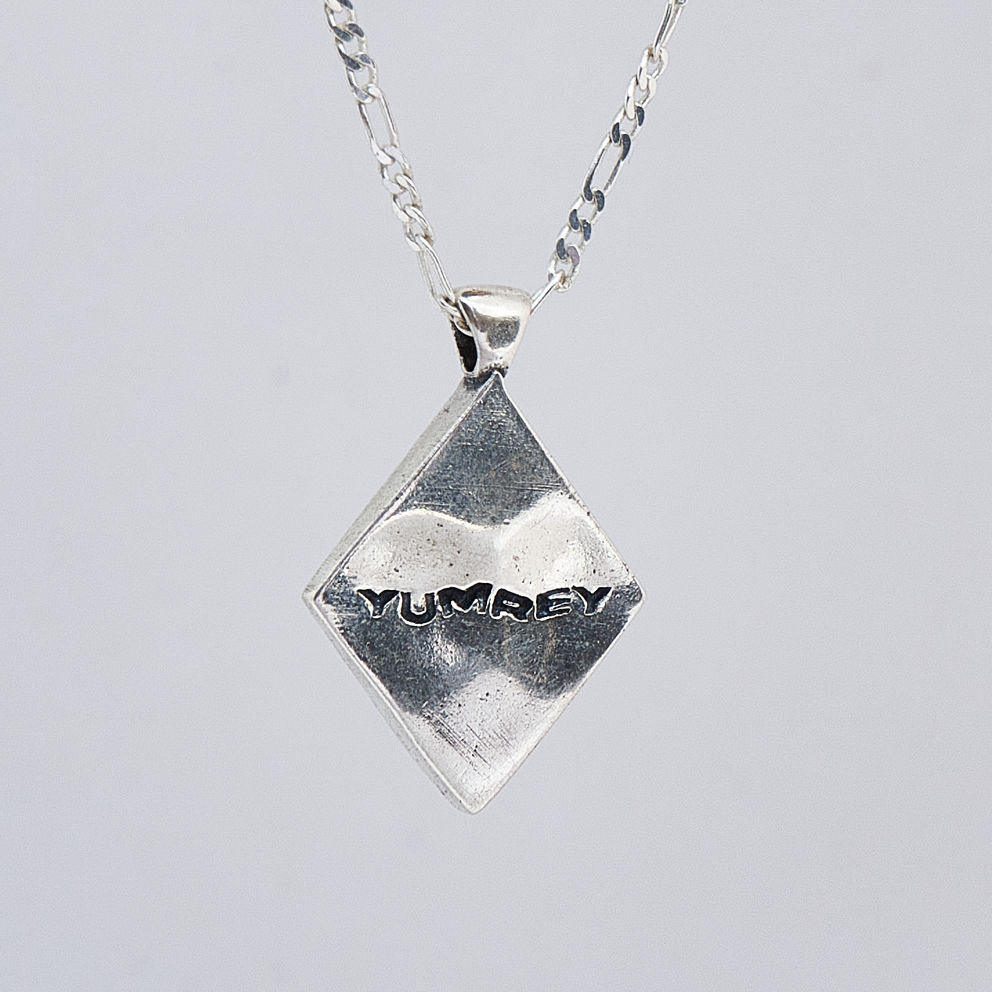 The pendant in the Harmony necklace is in the shape of a rhombus, which has three smaller rhombuses inside, and the inscription YUMREY is engraved on the back.