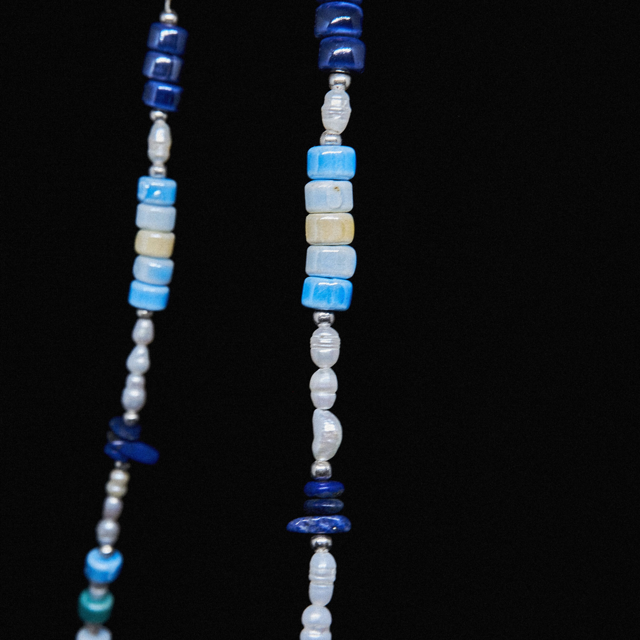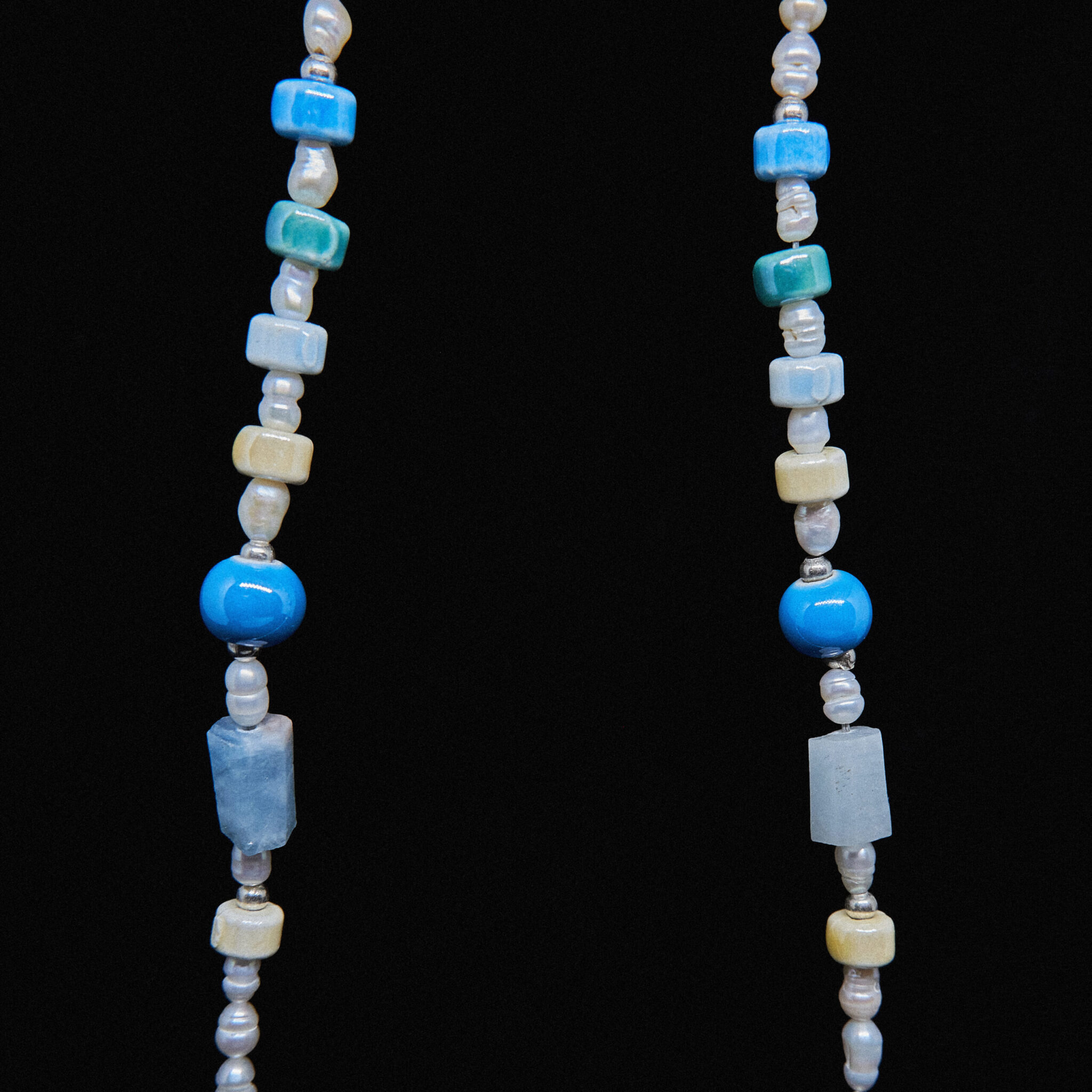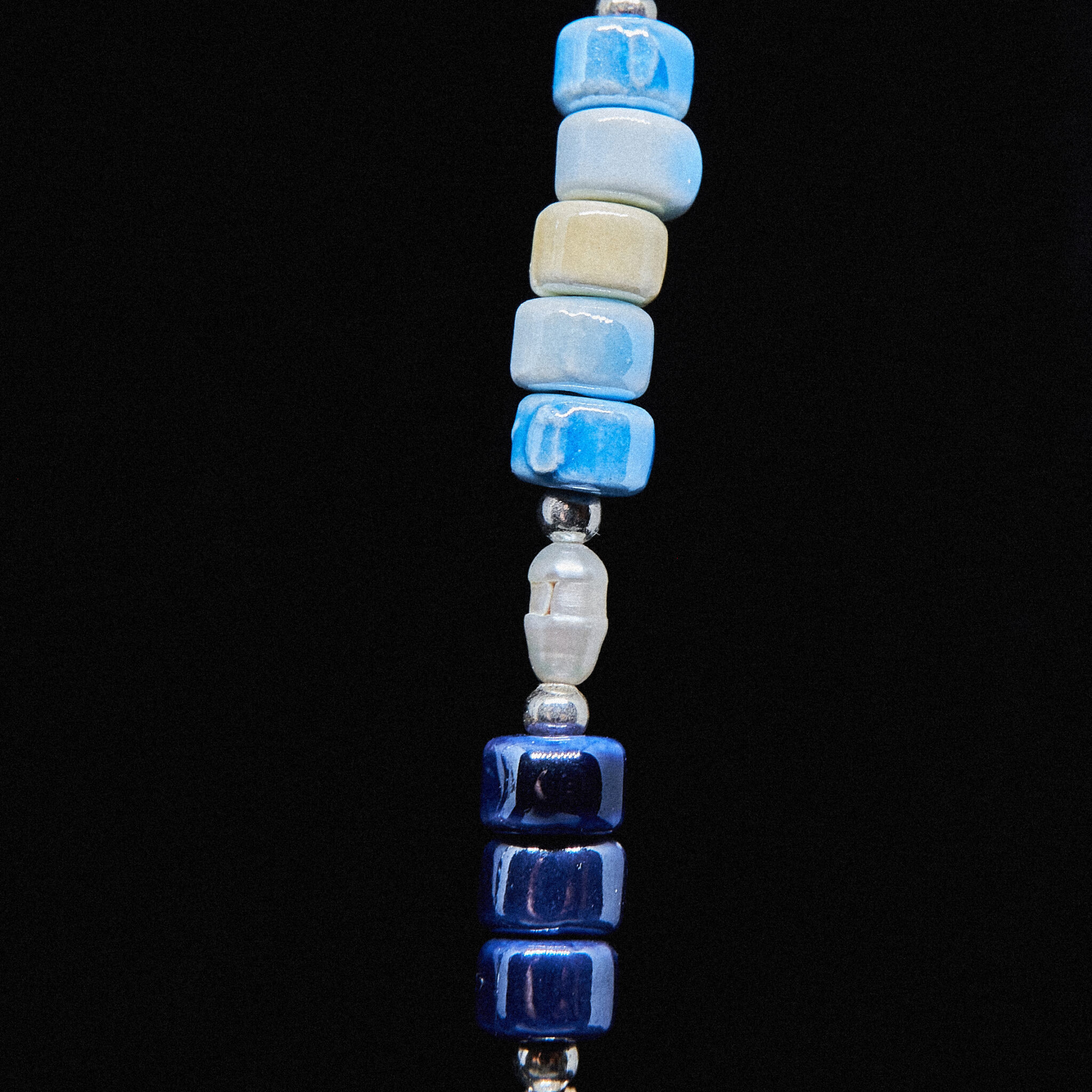 La Playa Azul necklace, ethnic pearls with colorful elements, perfect for summer. The necklace consists of several elements, including: natural cultured pearls, glass pearls, stones, ceramic beads and a stainless steel clasp. The jewelry is in shades of blue.