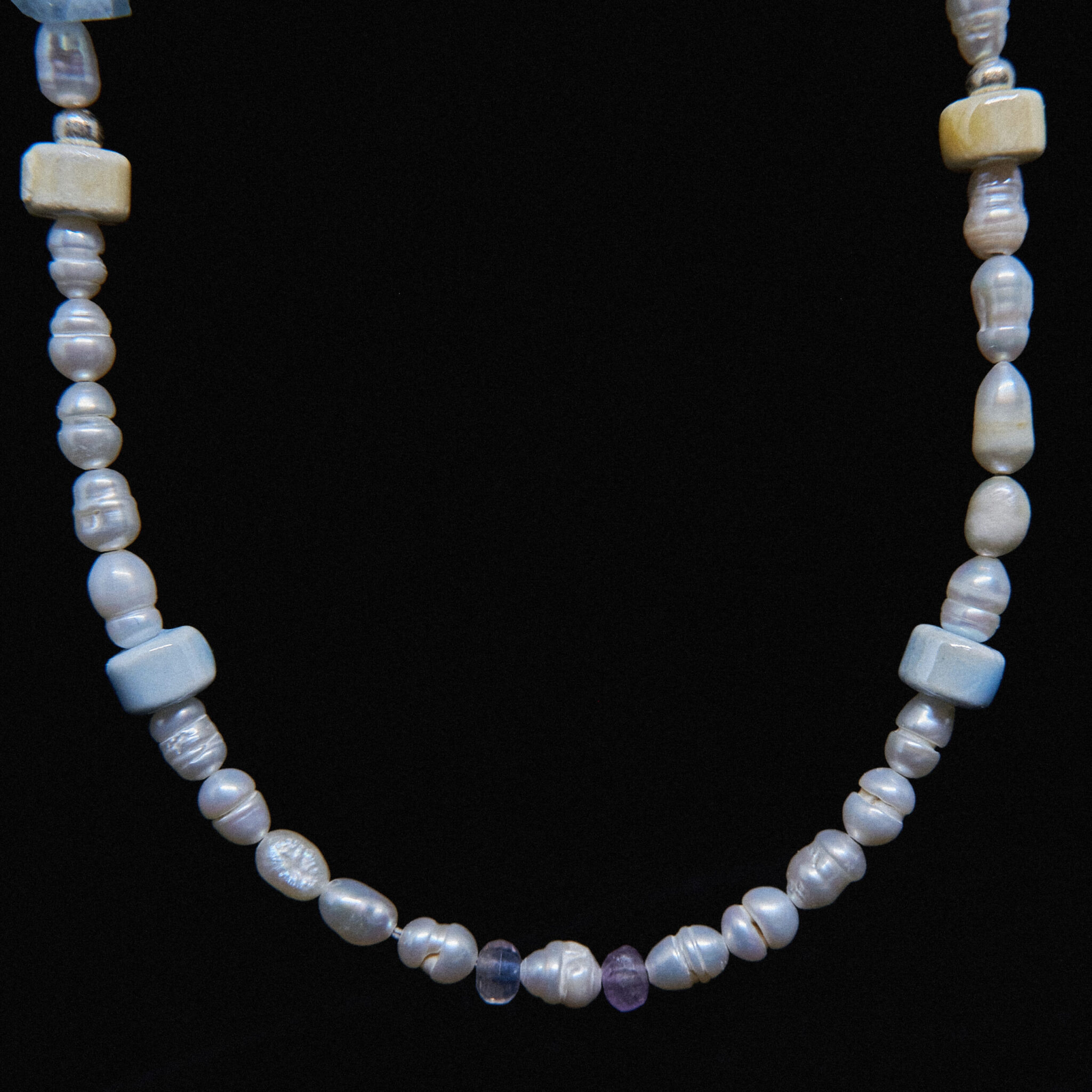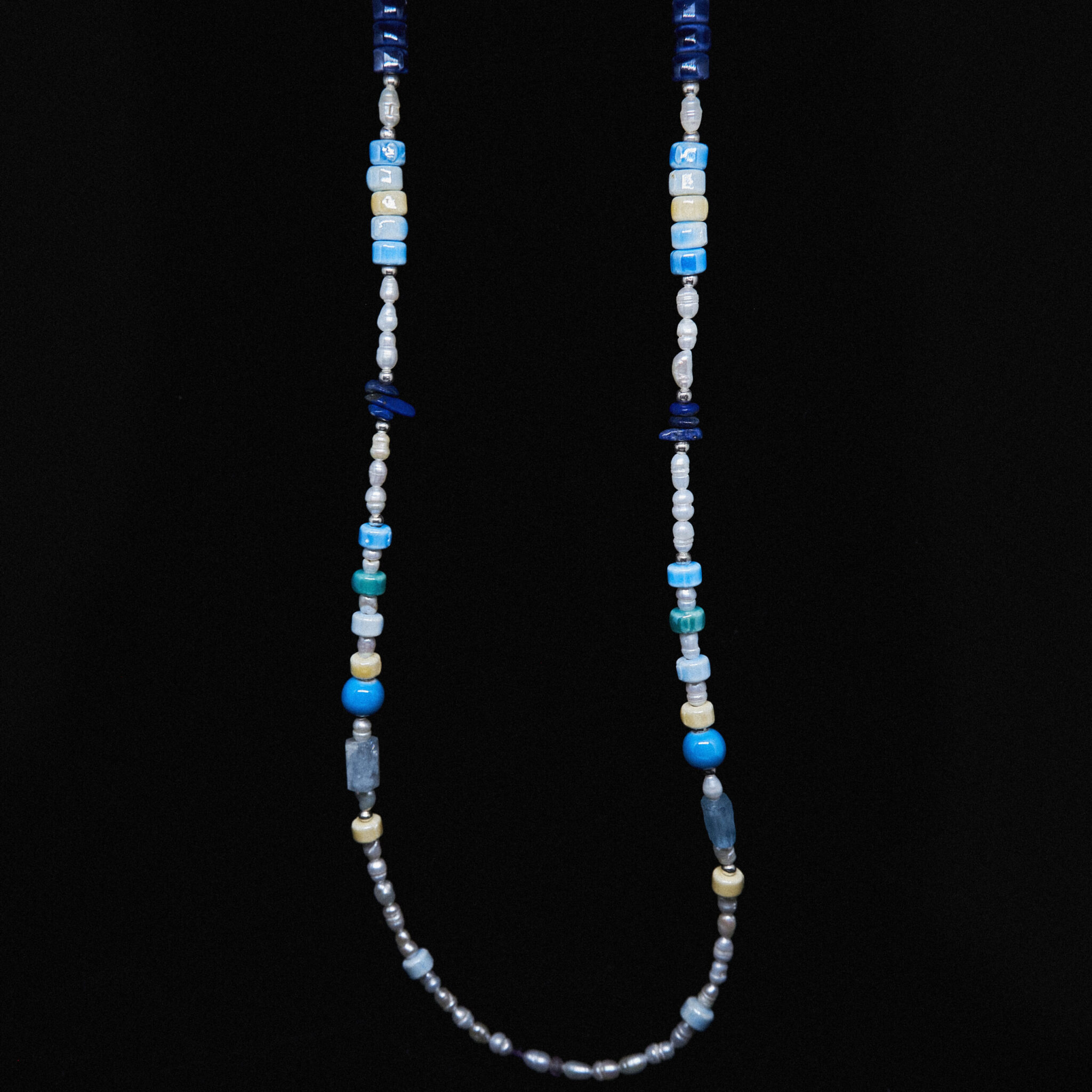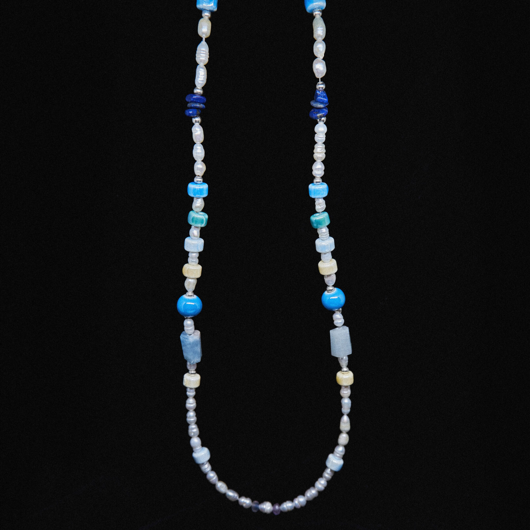 La Playa Azul necklace, ethnic pearls with colorful elements, perfect for summer. The necklace consists of several elements, including: natural cultured pearls, glass pearls, stones, ceramic beads and a stainless steel clasp. The jewelry is in shades of blue.