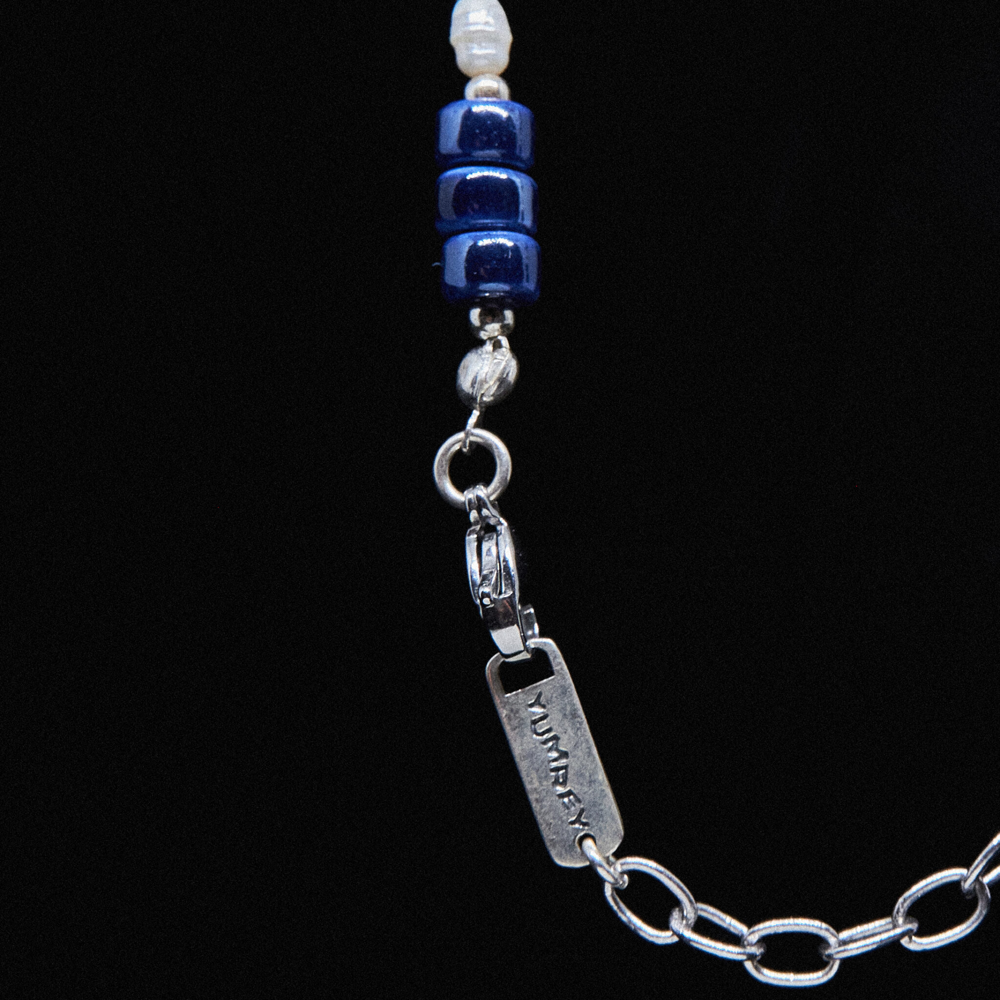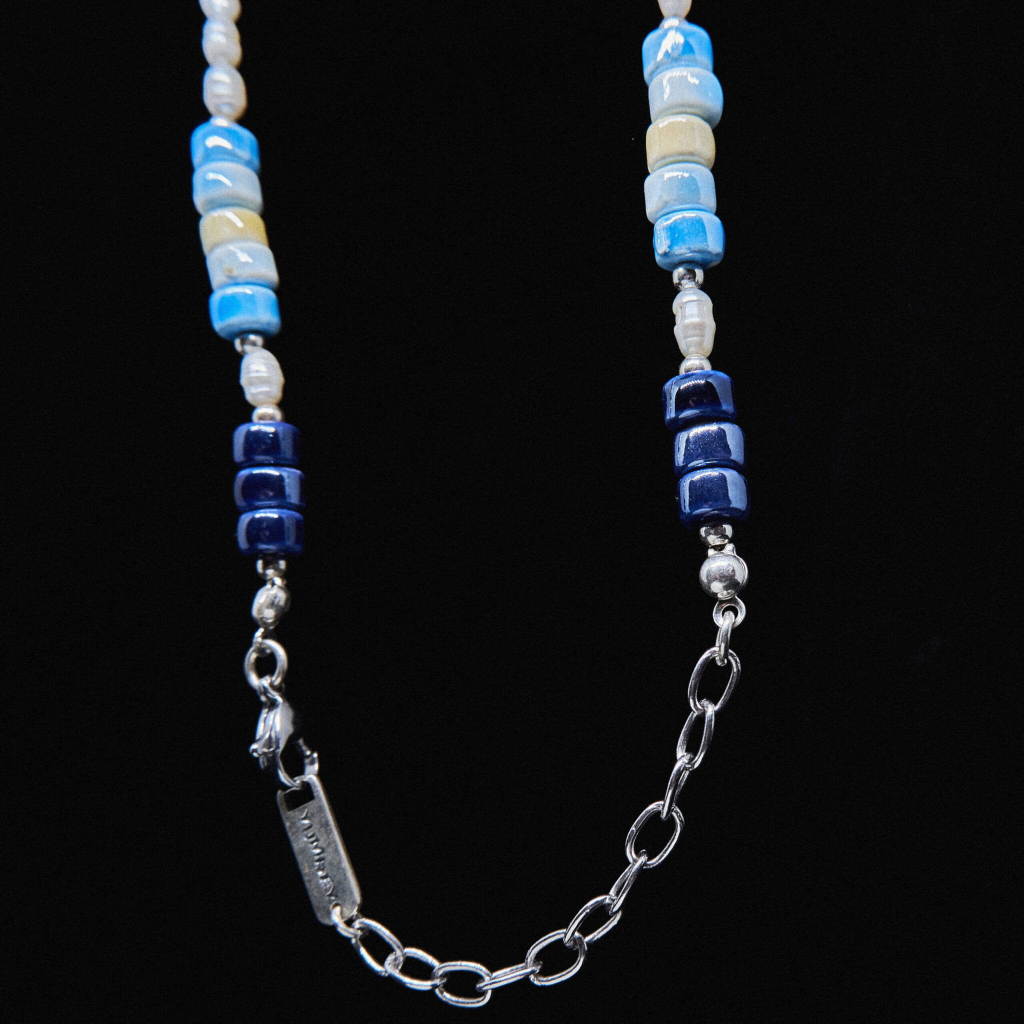 La Playa Azul necklace, ethnic pearls with colorful elements, perfect for summer. The necklace consists of several elements, including: natural cultured pearls, glass pearls, stones, ceramic beads and a stainless steel clasp. The jewelry is in shades of blue. The necklace is 47 cm long and has an extension that allows it to be extended by up to 5 cm. Each necklace is signed with a 1 cm plaque with the YUMREY brand name.