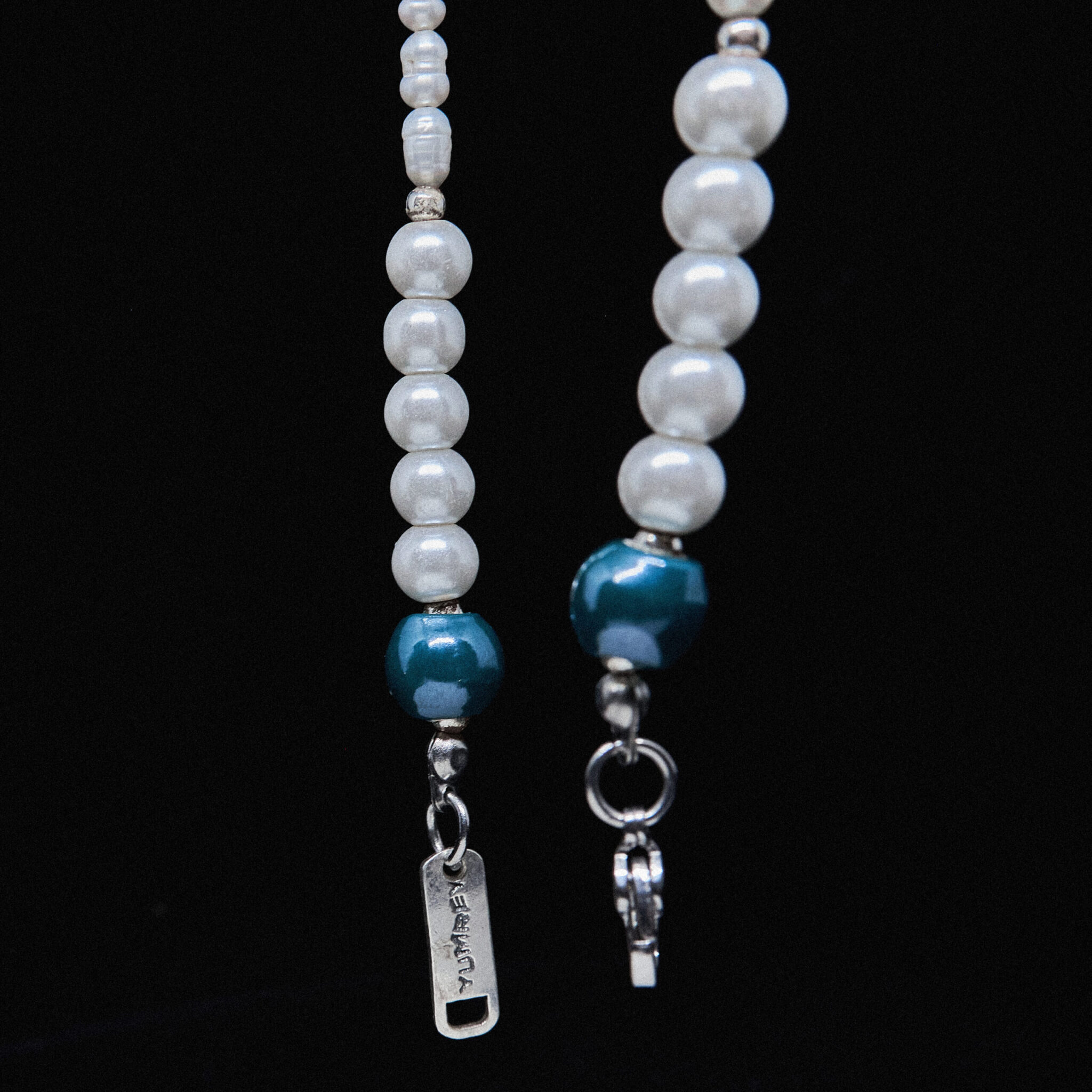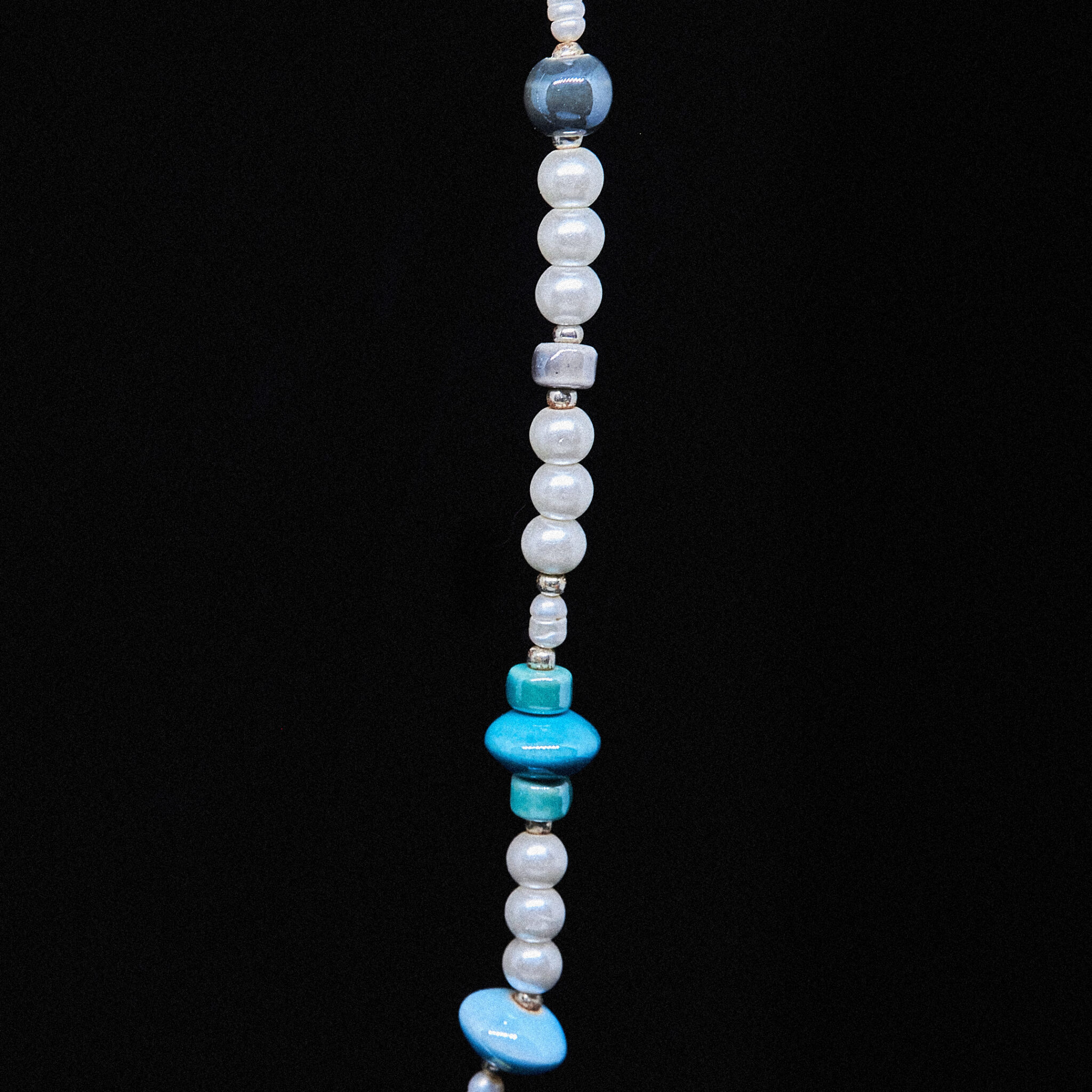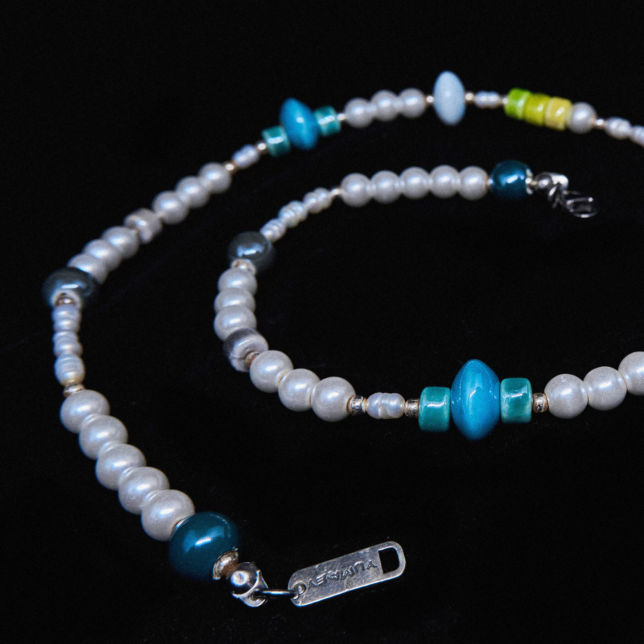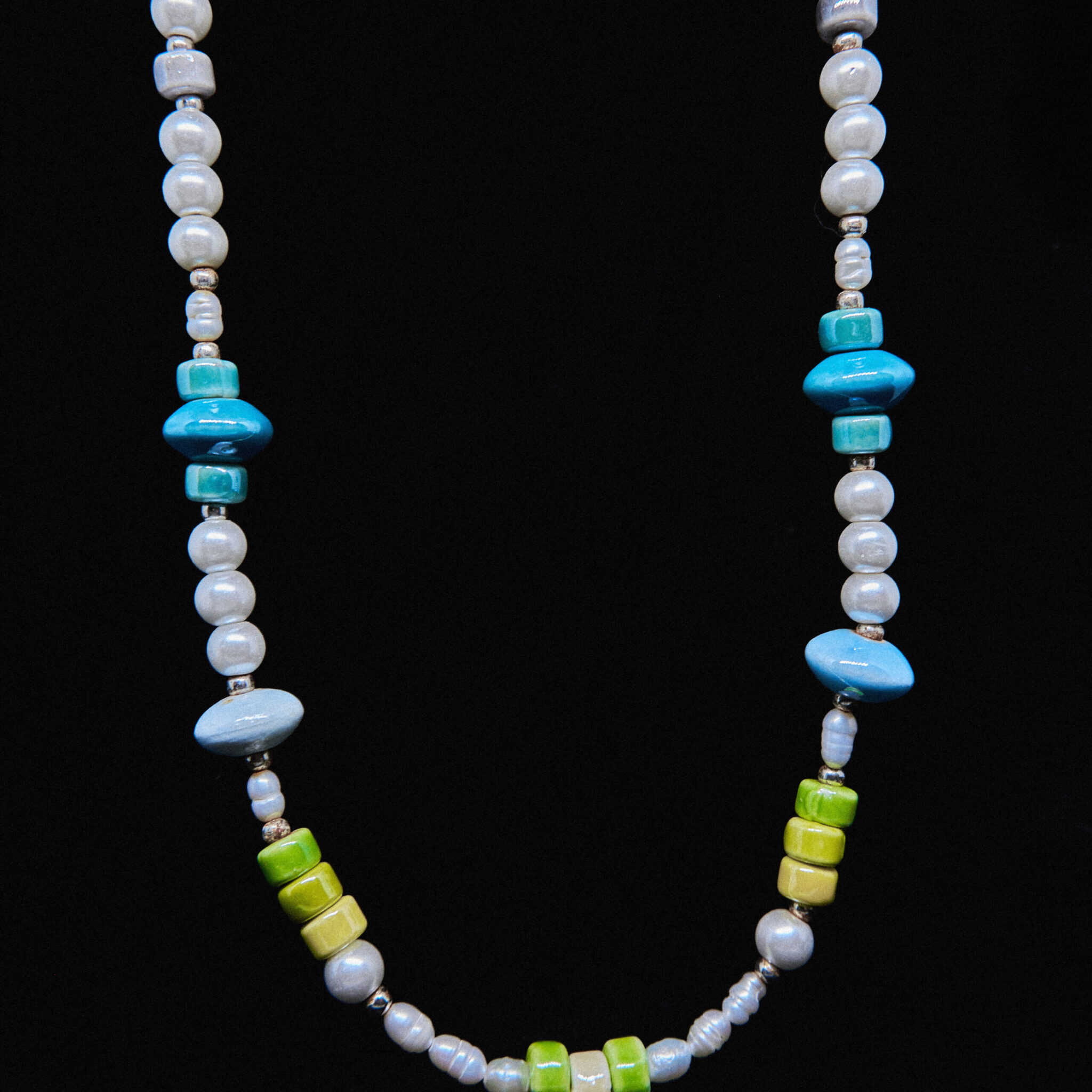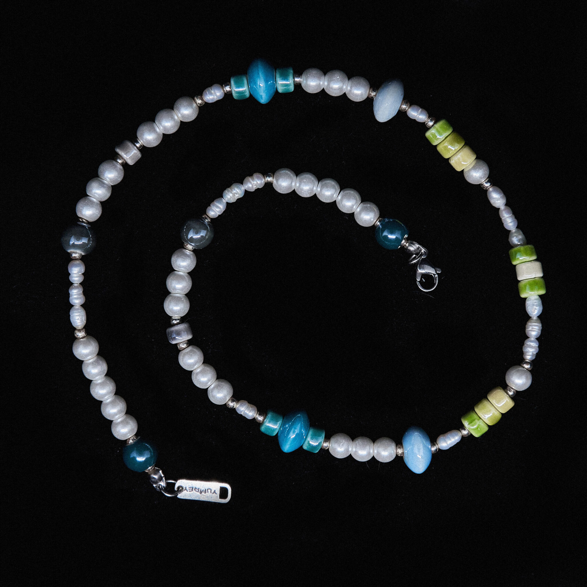 The La Playa Verde necklace features ethnic pearls with colorful elements, perfect for summer. The necklace is composed of several elements, including natural cultured pearls, glass pearls, stones, ceramic beads, and a stainless steel clasp. The jewelry is in shades of green. The necklace measures 44 cm long and ends with an extension that allows for an additional 5 cm of length. Each necklace is signed with a 1-centimeter plaque bearing the YUMREY brand name.