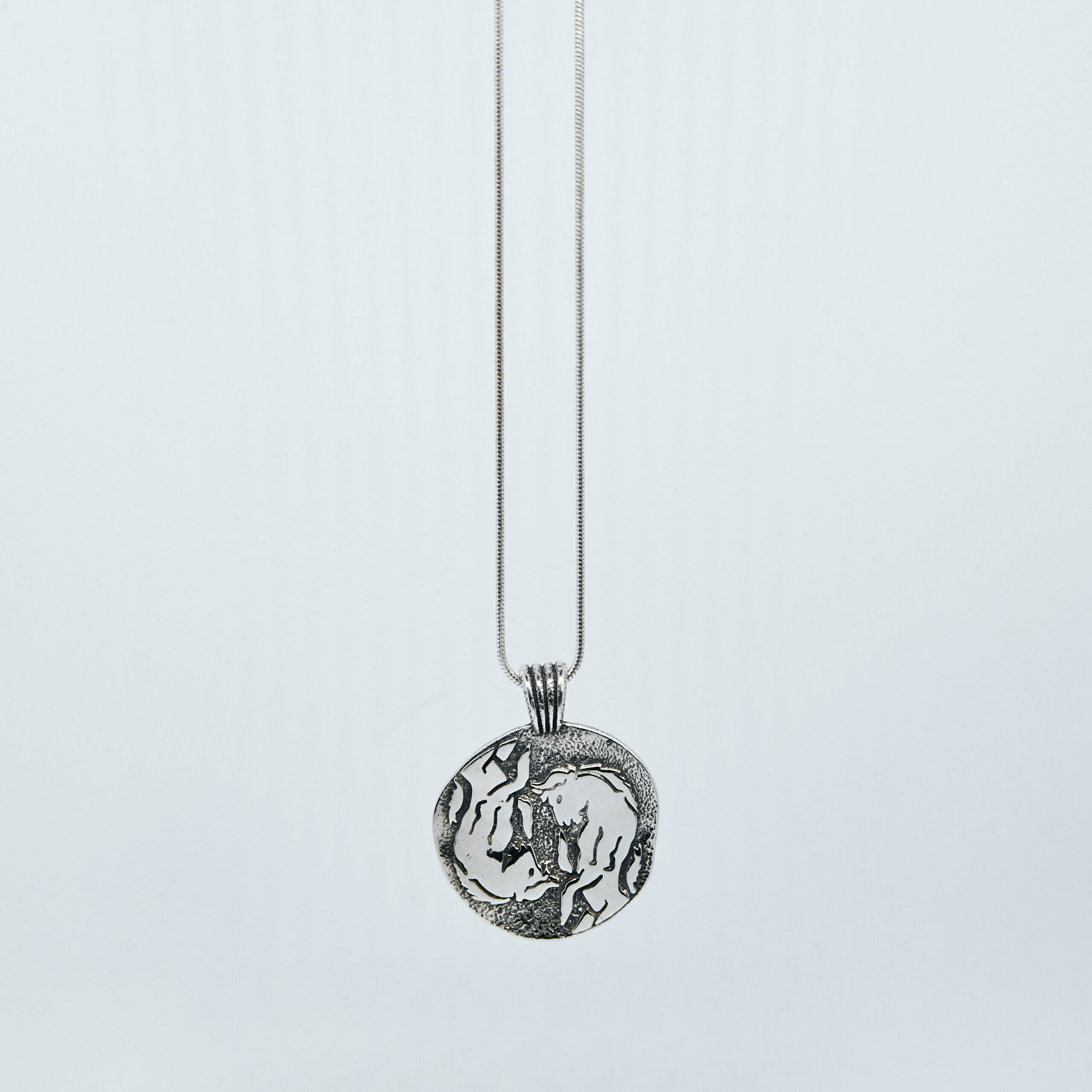 Un collier inspiré de la mythologie grecque. Il peut être porté de chaque côté. Pendentif avec l’image d’un minotaure sur le devant et un labyrinthe sur le revers. Argent 925.
