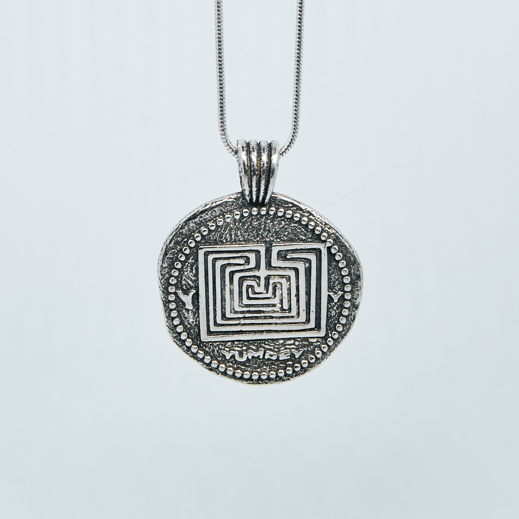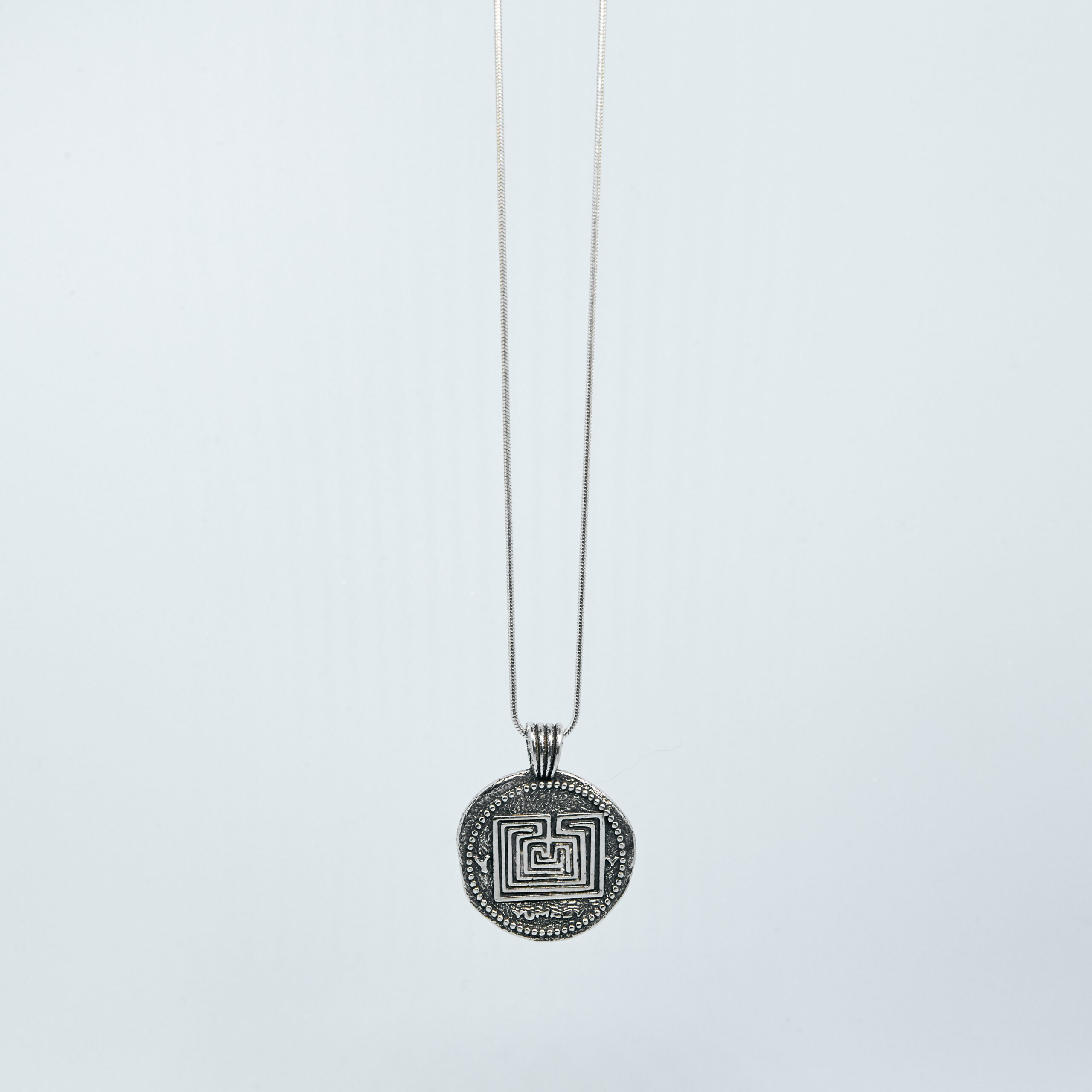 Naszyjnik inspirowany mitologią grecką. Można nosić go z obu stron. Zawieszka z wizerunkiem minotaura na przodzie i labiryntem na rewersie. Wyjątkowa, oryginalna, antyczna zawieszka w kształcie monety. Delikatny elegancki naszyjnik wężykowy w komplecie. Naszyjnik posiada sygnowaną logiem YUMREY srebrną blaszkę przy zapięciu. Całość wykonana ze srebra 925.