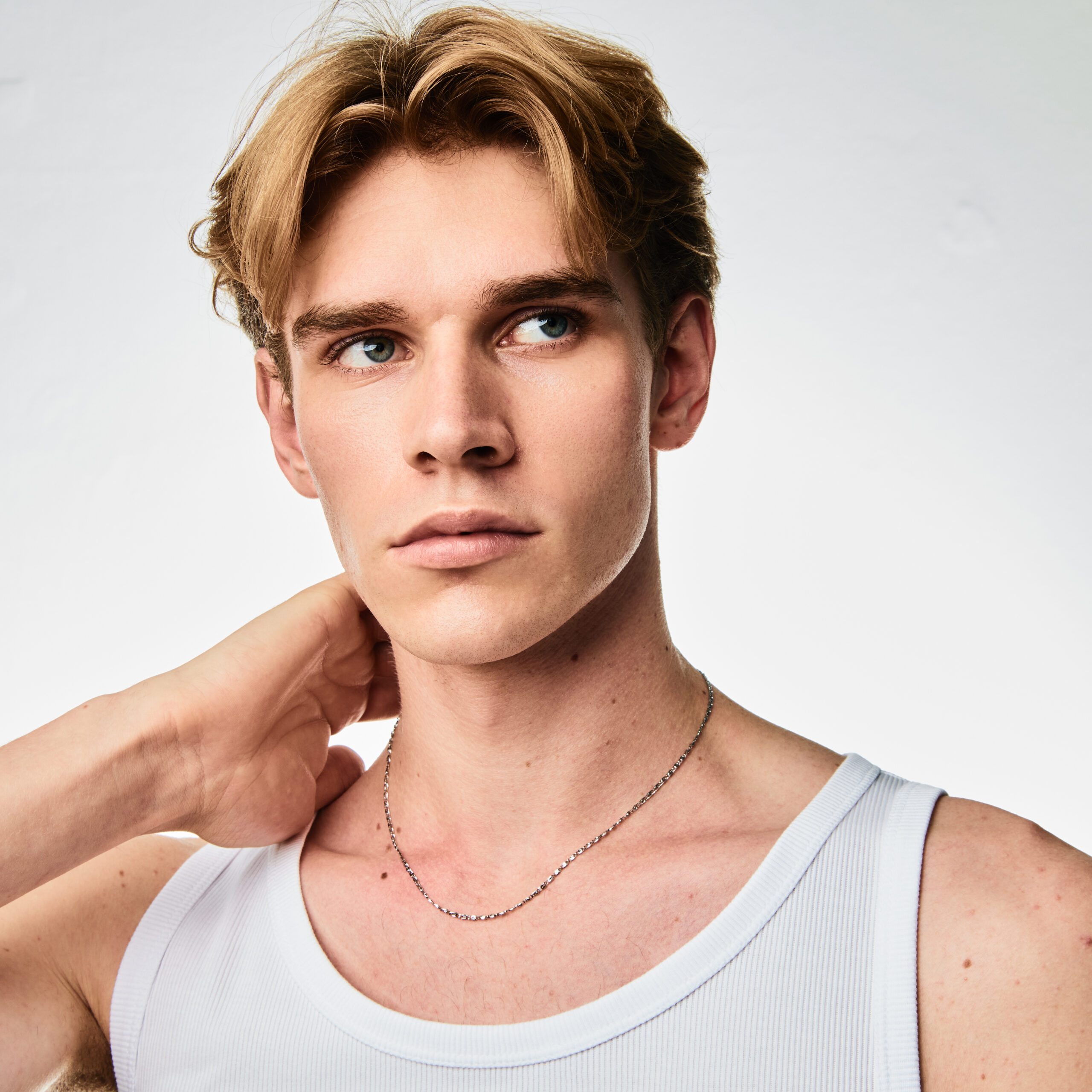 Naszyjnik Essence, wykonany z trwałej stali chirurgicznej, ma 43 cm długości. Na jego końcu znajdziesz plakietkę z wygrawerowaną nazwą YUMREY, która umożliwia regulację długości o 1 cm. Delikatny splot przypomina małe, połączone ze sobą oczka.