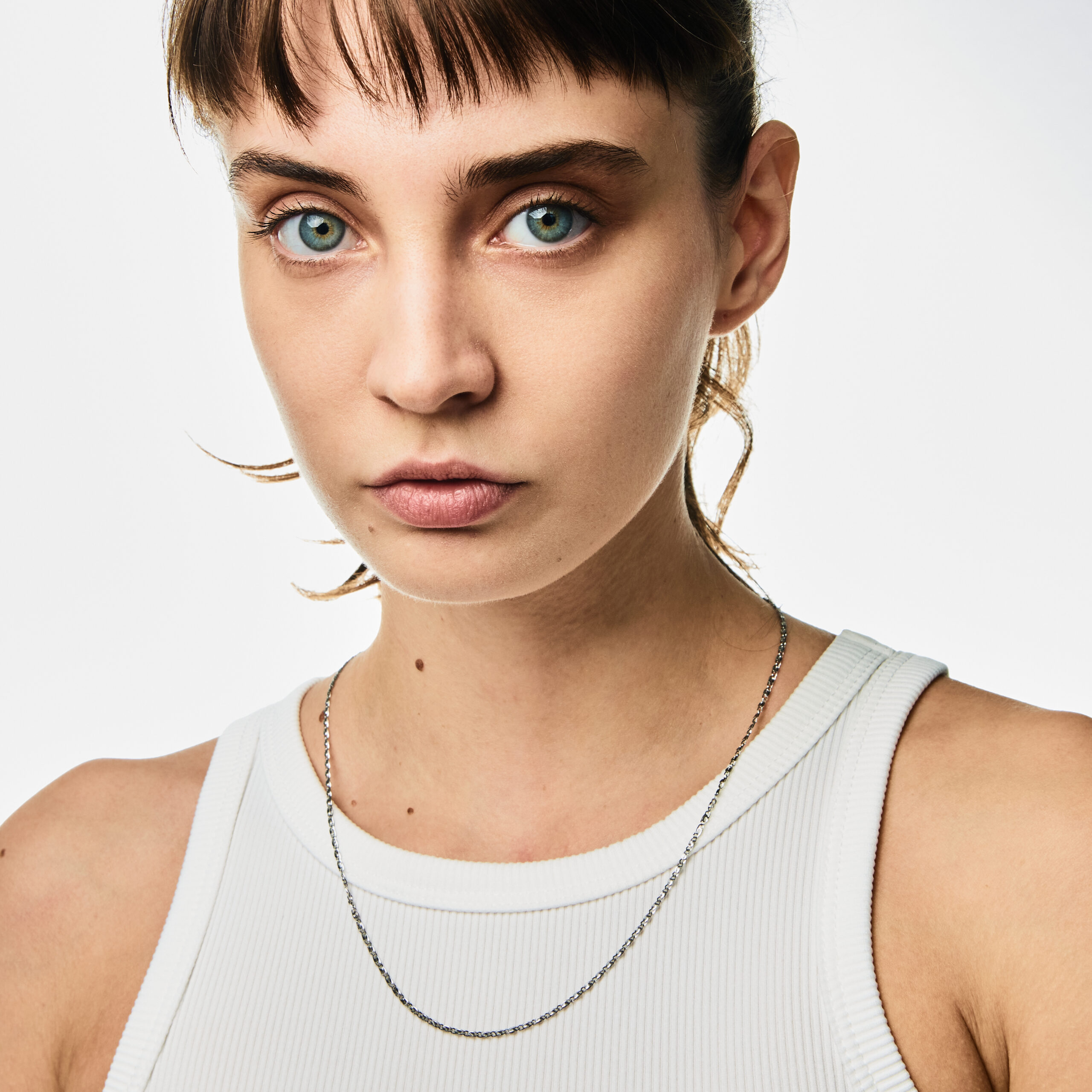 Naszyjnik Essence wykonany ze stali chirurgicznej o długości 43 cm, każdy z łańcuchów zakończony jest plakietką z wygrawerowaną nazwą YUMREY, która może służyć jako regulacja naszyjnika o 1 cm. Naszyjnik wykonany jest z delikatnego splotu przypominające małe związane ze sobą oczka.