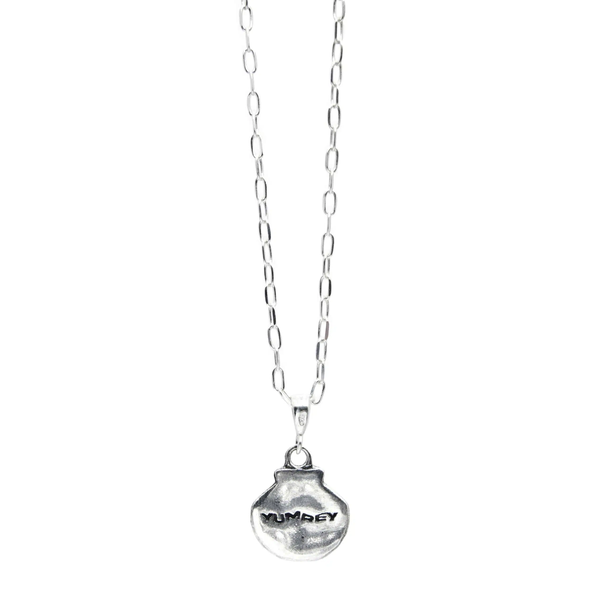 Zawieszka w naszyjniku Venus jest w kształcie muszelki, na tyle ma wygrawerowany napis YUMREY.