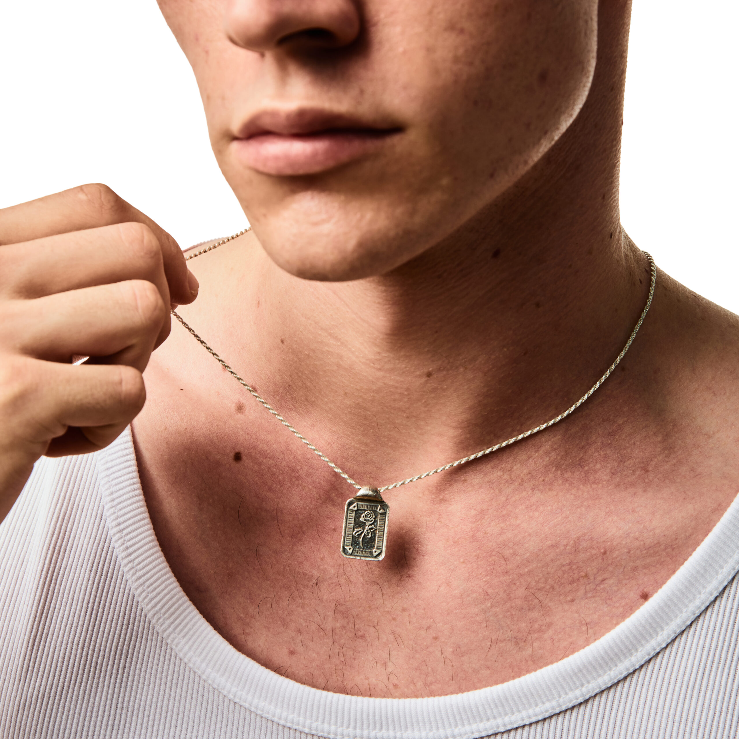 Naszyjnik ROSE to delikatny naszyjnik z designem zakręconej liny z zawieszką w kształcie nieśmiertelnika z unikatowym wzorem róży. Srebro 925